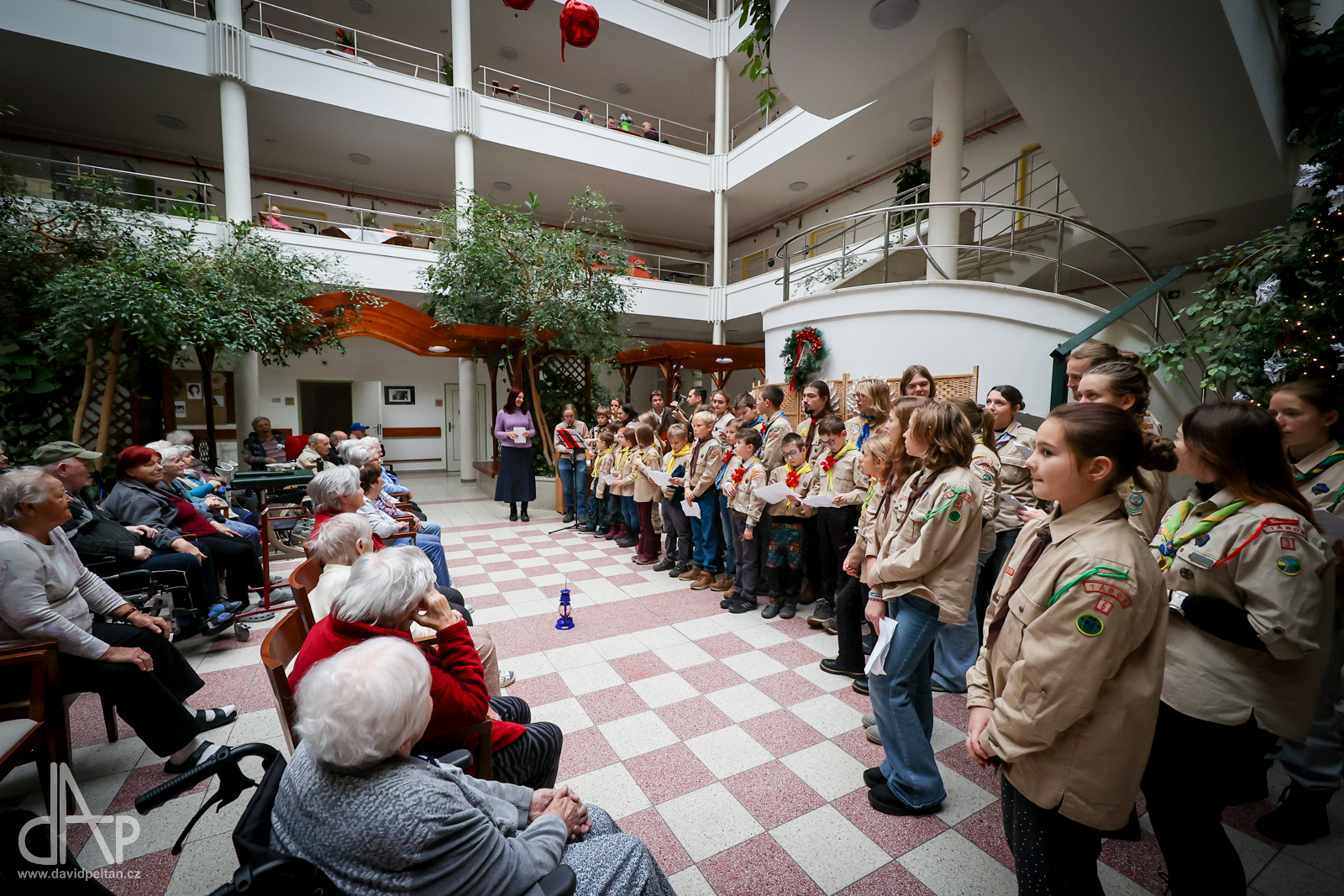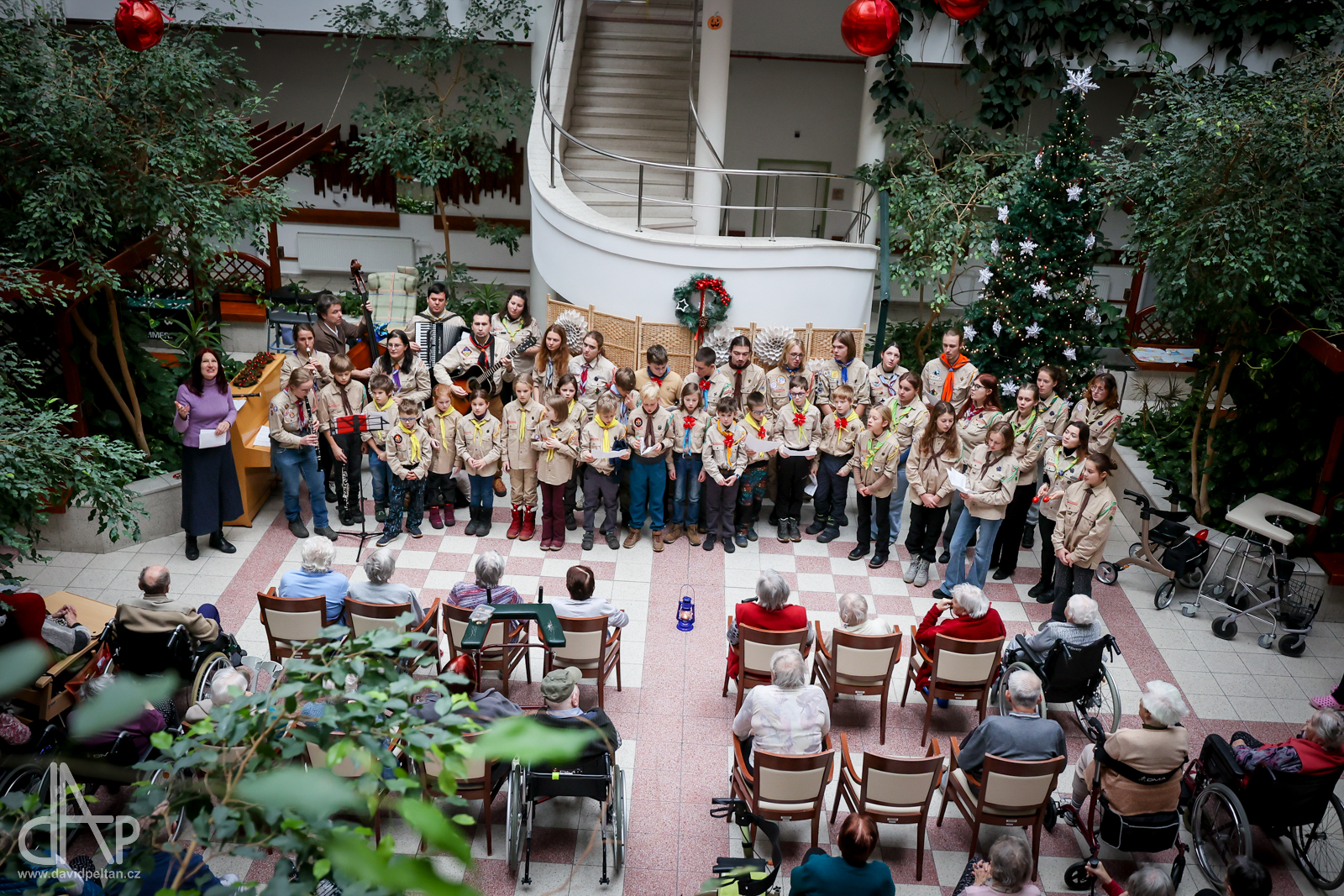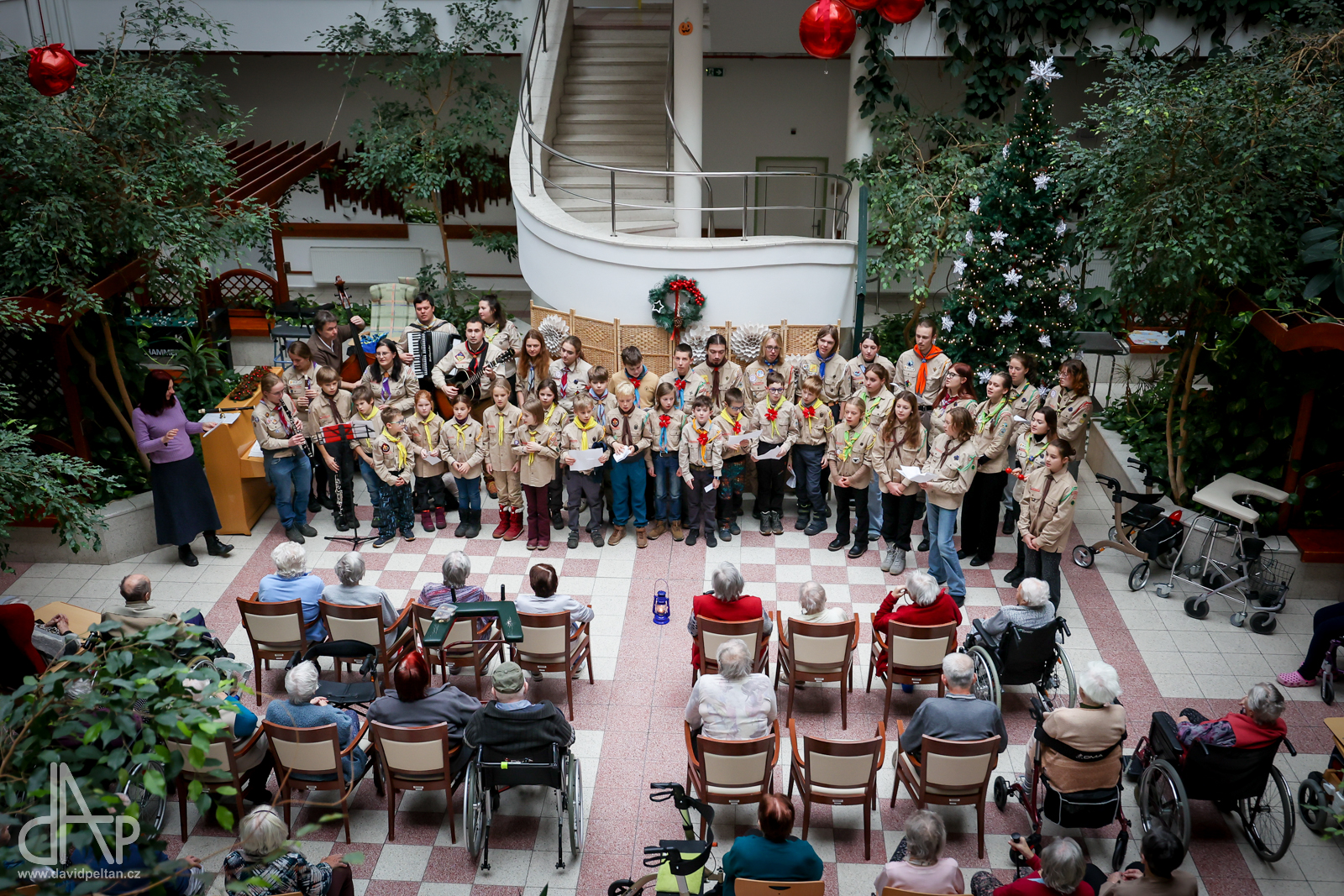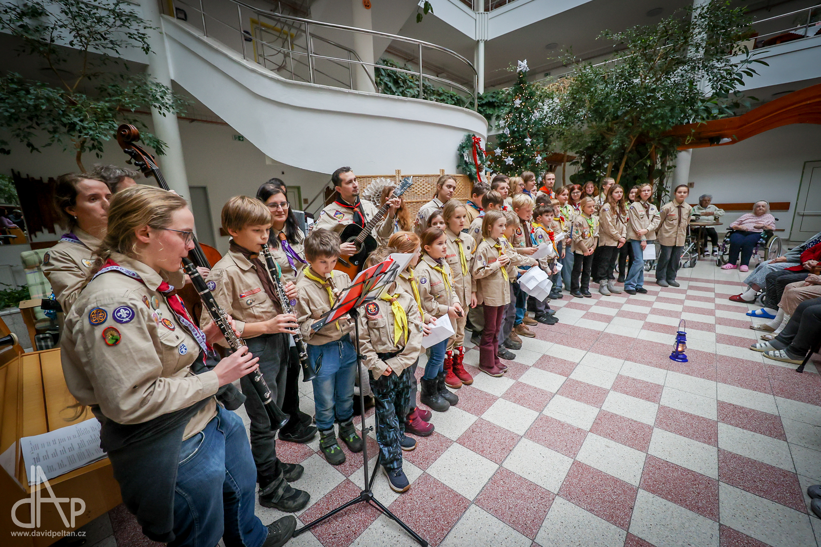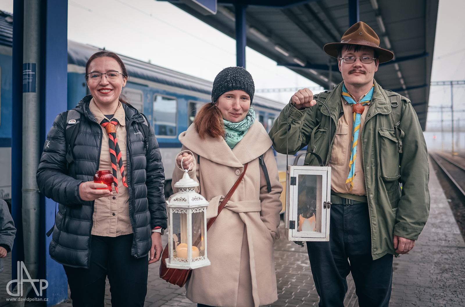 Skautský oddíl Kalich Tábor přivezl před Vánoci betlémské světlo na táborské vlakové nádraží. Další dny ho pak skauti roznášeli nejen do kostelů, ale i domů pro seniory, kde jim předávání světla zpříjemnili i hudebním vystoupením pod vedením Pavly Kohelové Jankové (foto z G-Centra Tábor). Oddíl Modříni Tábor pak na Štědrý den betlémské světlo za doprovodu krátkých blahopřání zástupců církví a hudebního vystoupení předával na táborském Žižkově náměstí.