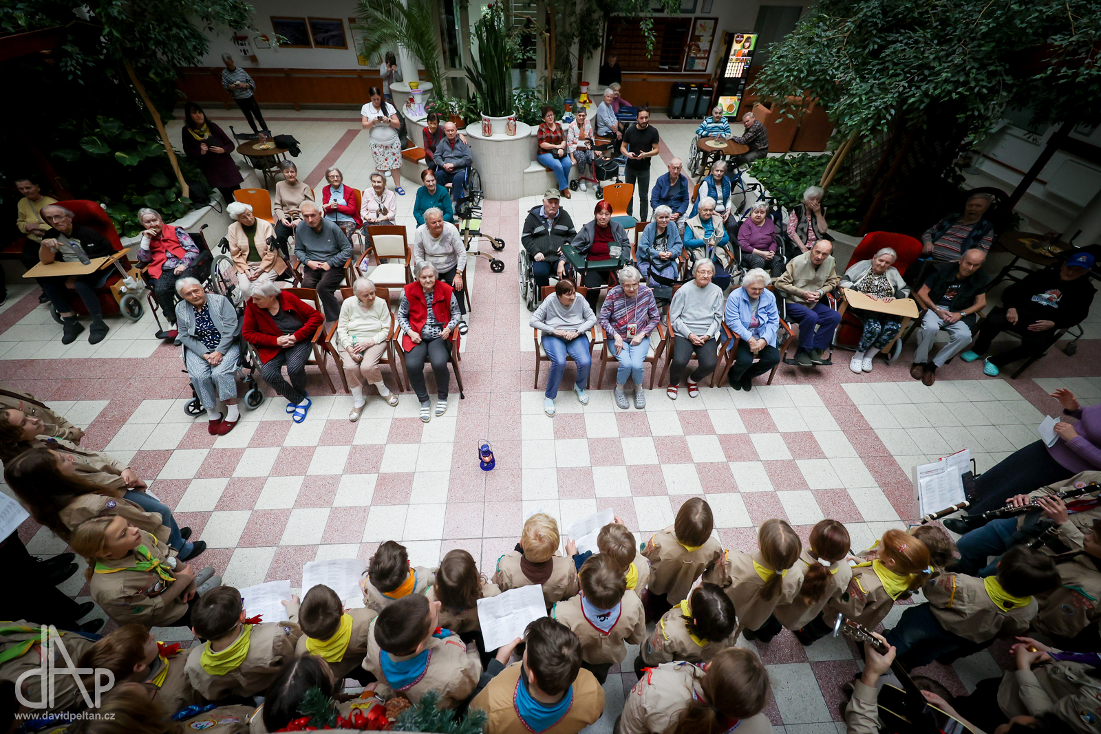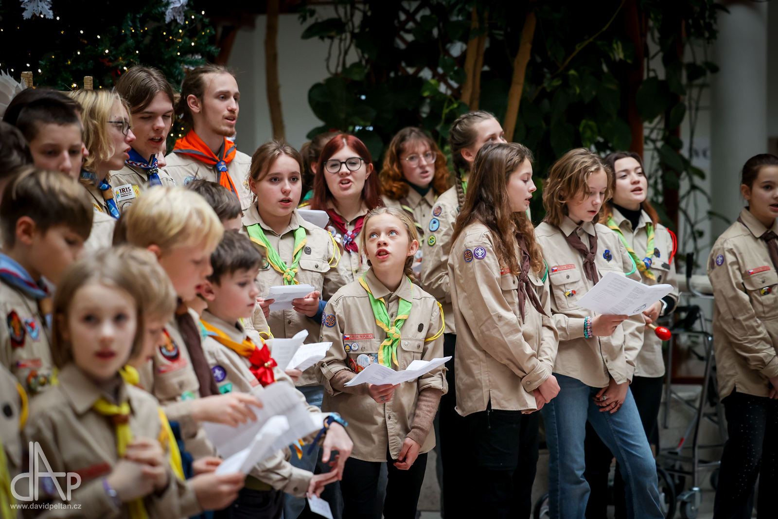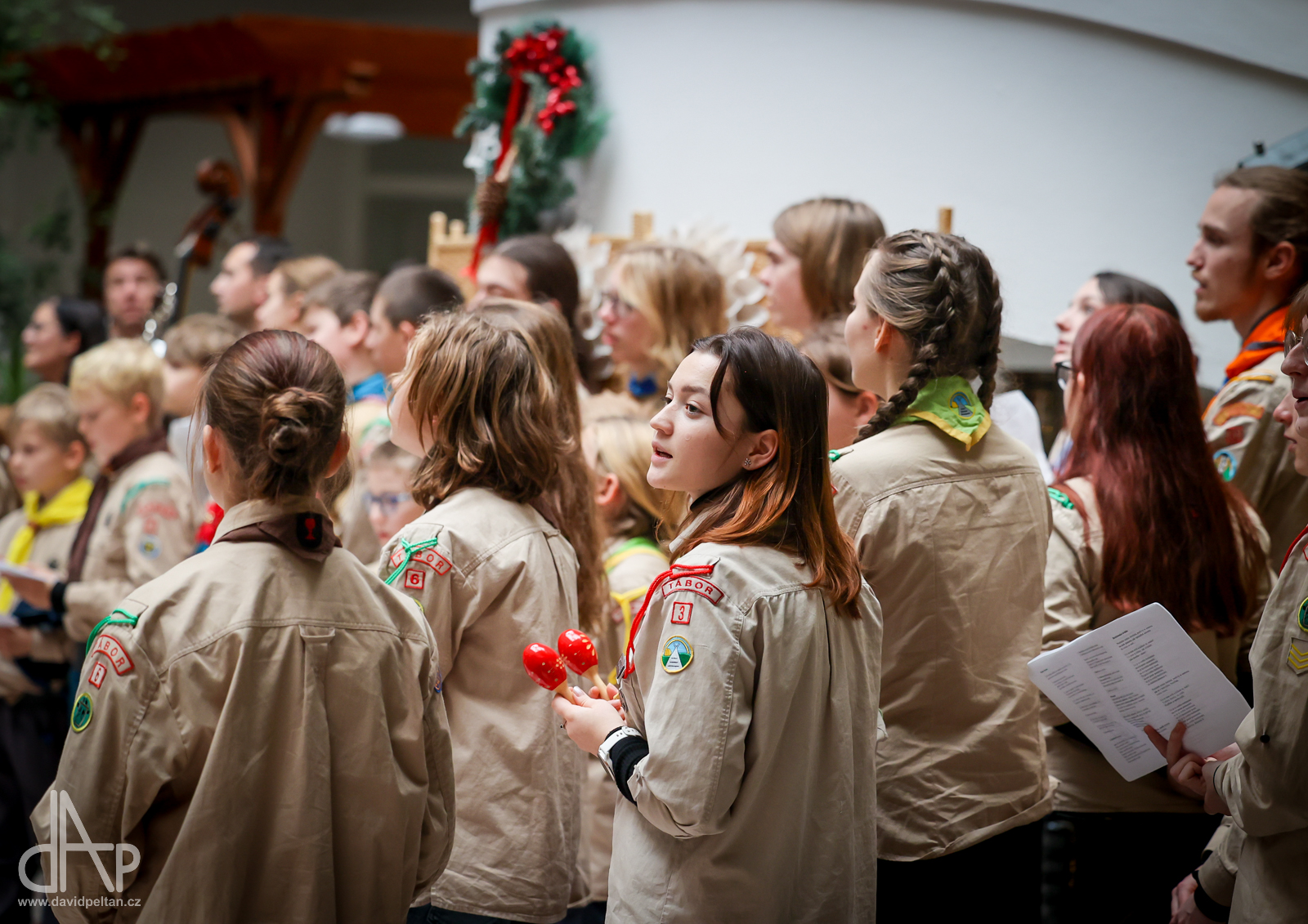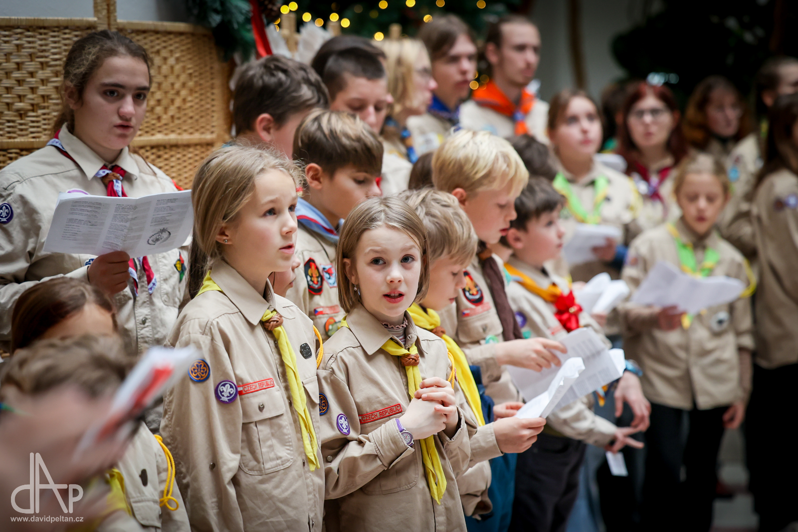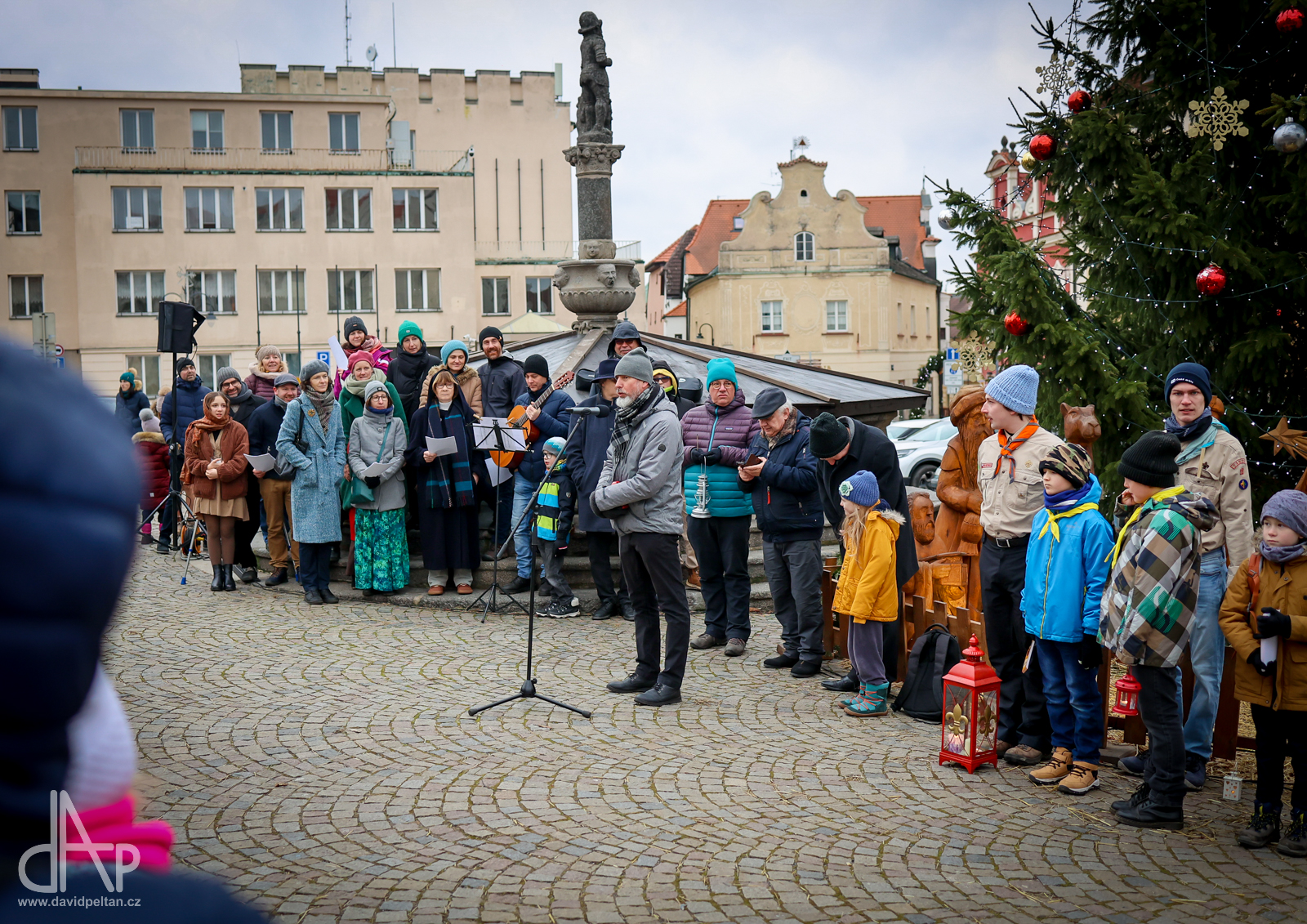 Skautský oddíl Kalich Tábor přivezl před Vánoci betlémské světlo na táborské vlakové nádraží. Další dny ho pak skauti roznášeli nejen do kostelů, ale i domů pro seniory, kde jim předávání světla zpříjemnili i hudebním vystoupením pod vedením Pavly Kohelové Jankové (foto z G-Centra Tábor). Oddíl Modříni Tábor pak na Štědrý den betlémské světlo za doprovodu krátkých blahopřání zástupců církví a hudebního vystoupení předával na táborském Žižkově náměstí.